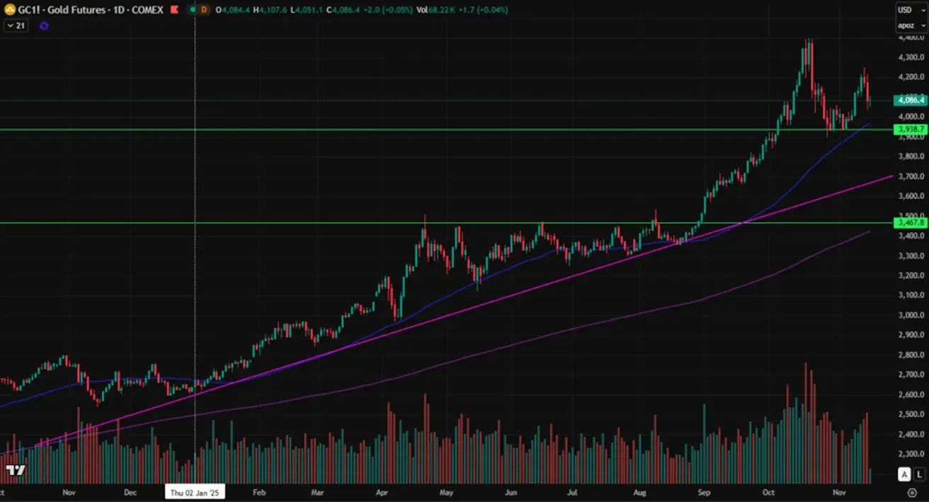 Gold Futures (GC): weekly performance: +1.19% (week closed at $4,084.4 per troy ounce). Year-to-date performance: +54.65%.