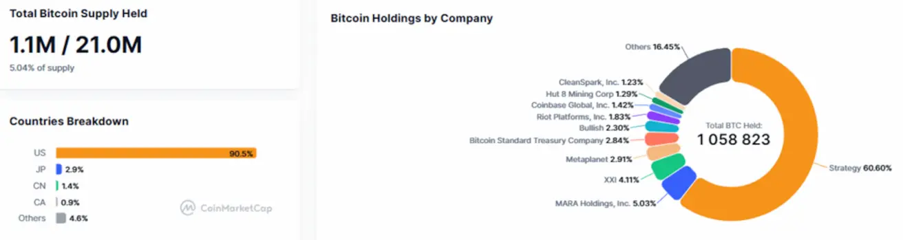 Public companies with a Bitcoin Treasuries strategy. The share of bitcoin held on corporate balance sheets remains unchanged from last week at 5.04% (vs. 5.04%) of total circulating supply.
