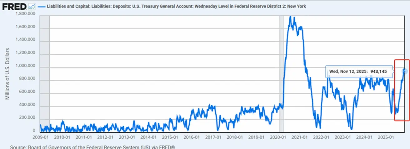 Because federal operations were halted, government outlays were effectively frozen, pushing the Treasury General Account (TGA) to nearly one trillion dollars.