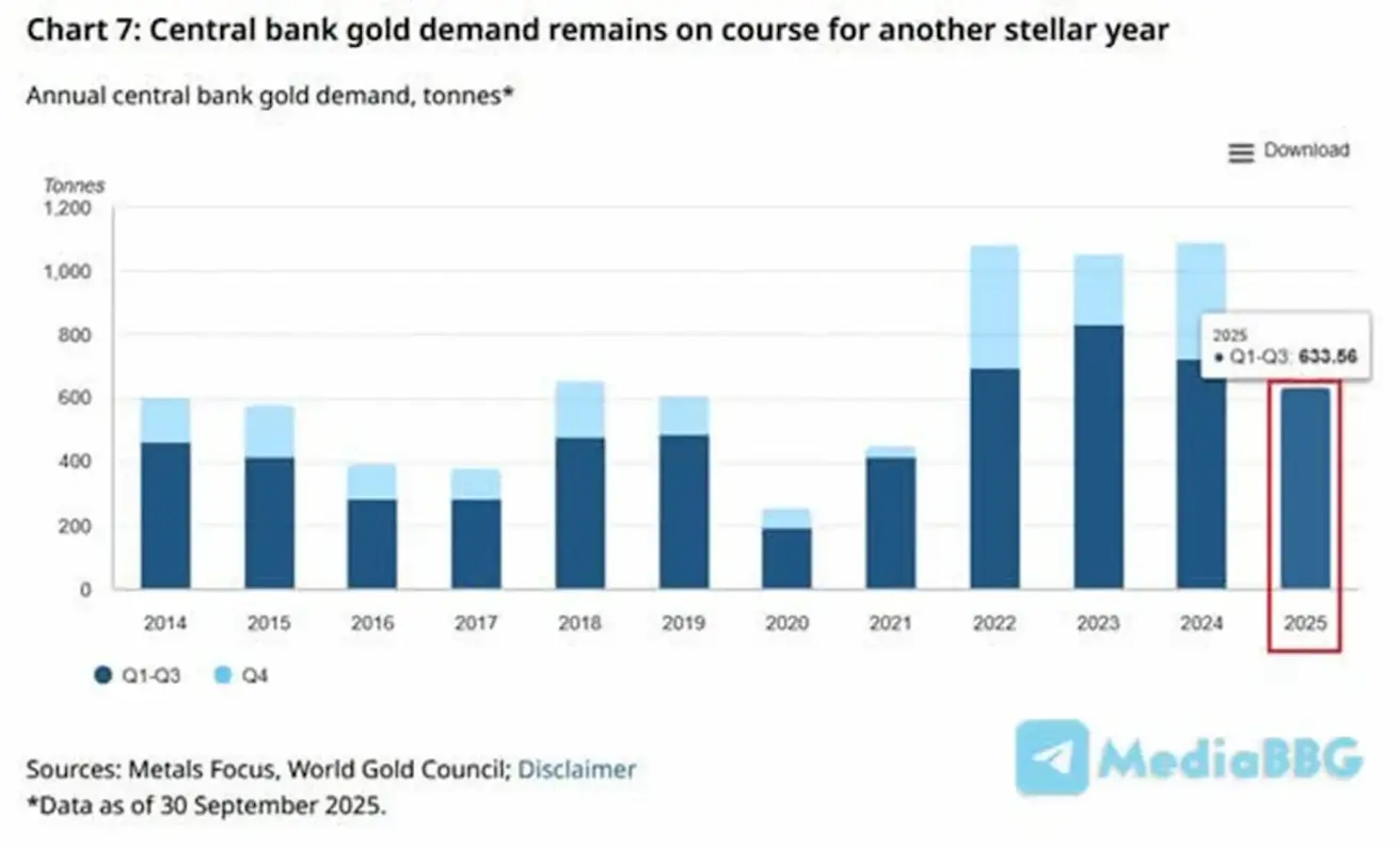 Global central banks continued to actively increase their gold reserves, reaching a total of 633 tonnes over the first three quarters of 2025.