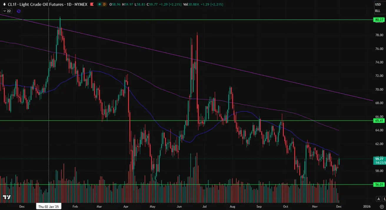 Weekly performance: +0.86% (week closed at $58.48/barrel). Year-to-date: –18.61%.