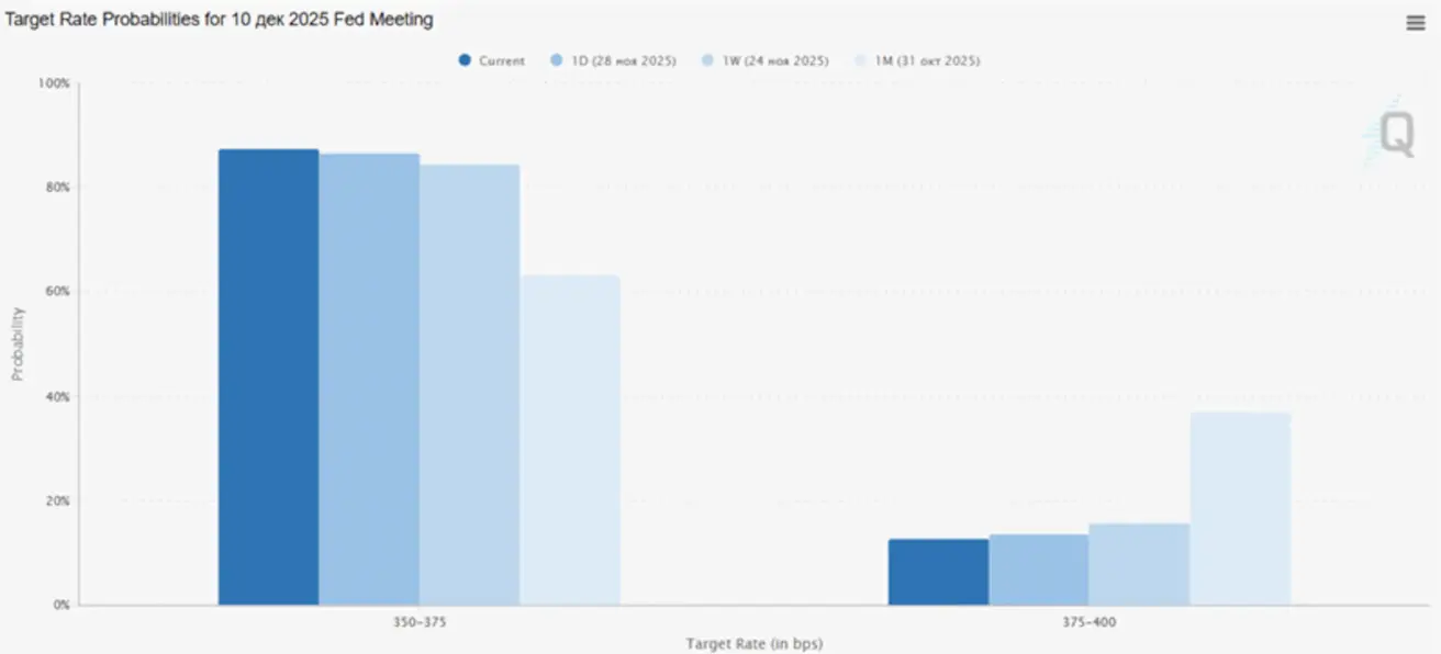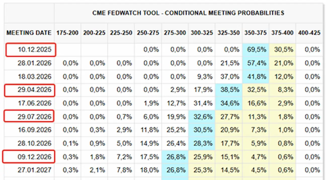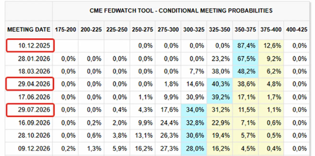 - For the upcoming meeting on December 10: the estimated probability of a 25 bps rate cut stands at 87.4%.
