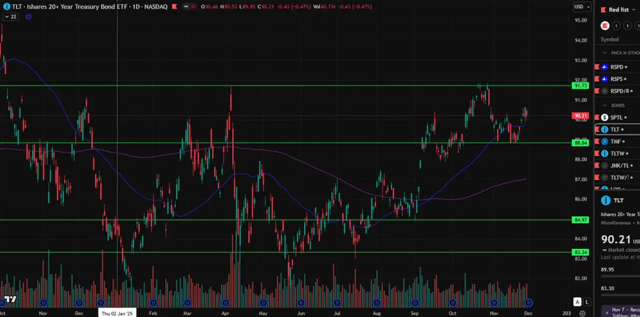 U.S. Treasuries 20+ Years (ETF: TLT): Weekly performance: +0.69% (week closed at 90.21). Year-to-date: +2.74%.