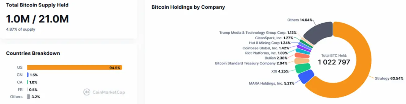 Public companies following a Bitcoin Treasuries strategy currently hold 4.87% of the total Bitcoin supply on their balance sheets (vs 5.08% last week).