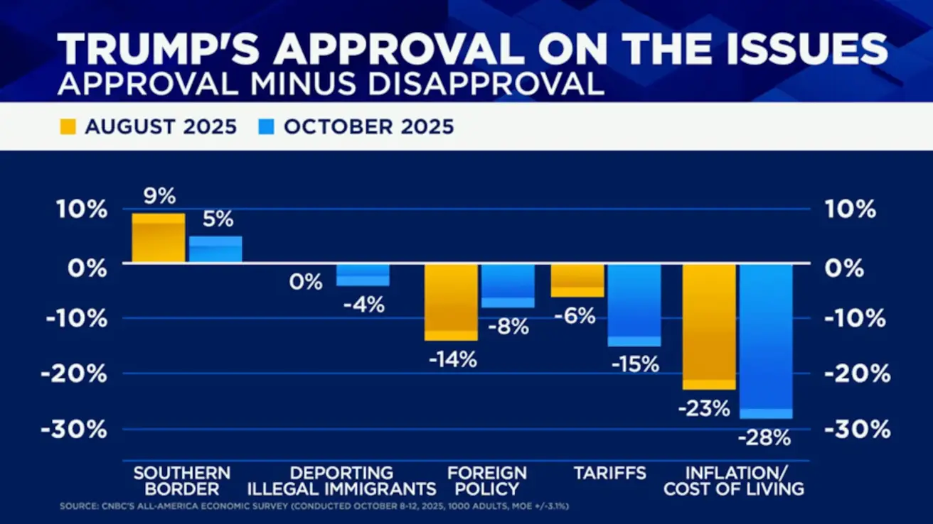 Trump’s disapproval rating amid the government shutdown (CNBC poll) rose from 43% in August to 55% in October. Key drivers: tariffs and inflation: