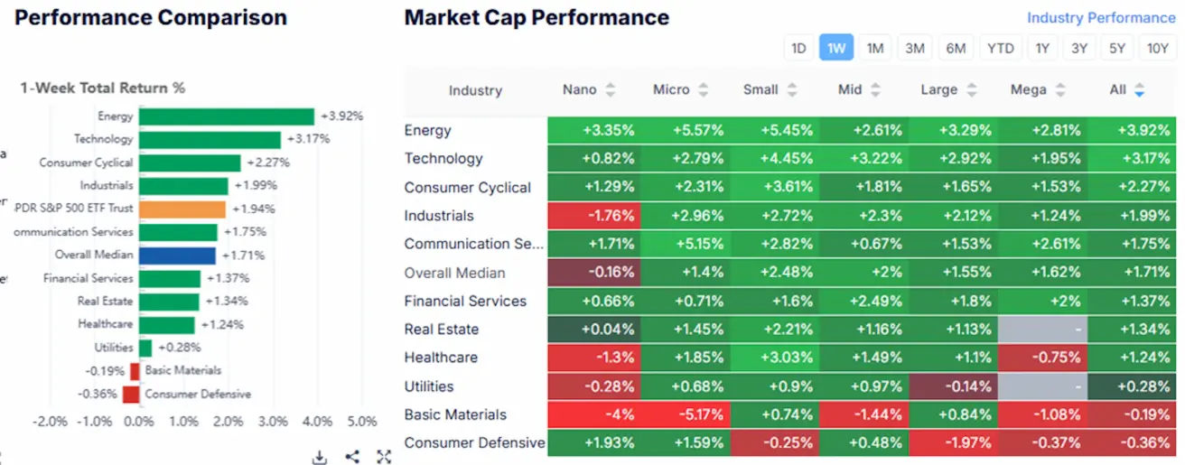 By the end of the week, the median gain stood at +1.71%. Leaders: energy, technology, and consumer cyclical sectors. Laggards: consumer defensive, basic materials, and utilities.