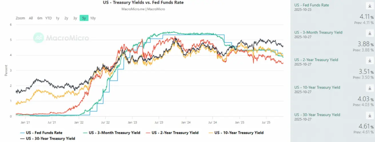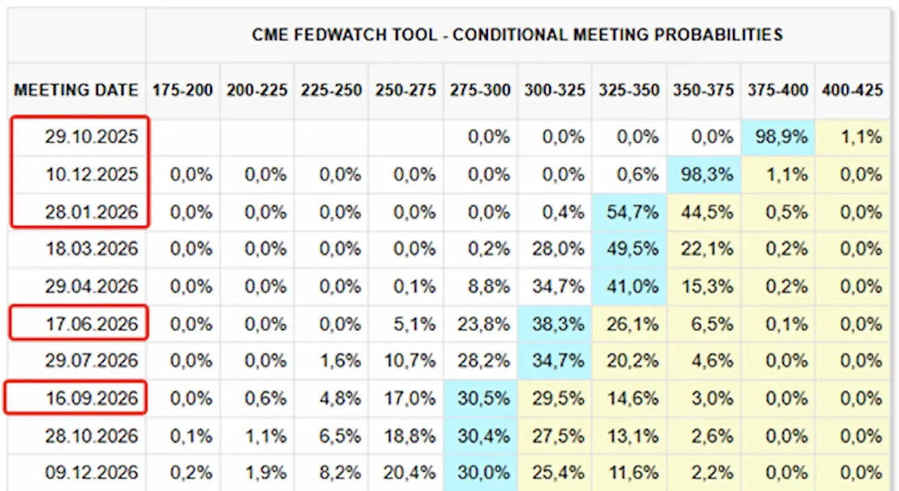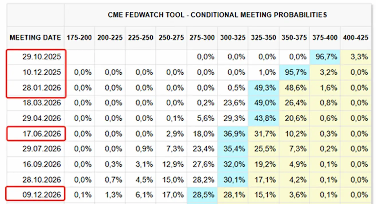 - Next meeting (October 29): The implied probability of a 25 bps rate cut stands at 96.7%, and the market now anticipates two cuts in total by year-end, bringing the target range to 3.50–3.75%.