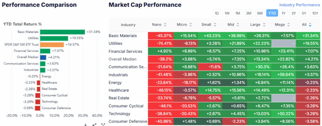 Year-to-Date (the period from the beginning of the year to the current date): +4.21%. Leaders: the basic materials sector, the utilities sector, and the financial sector.