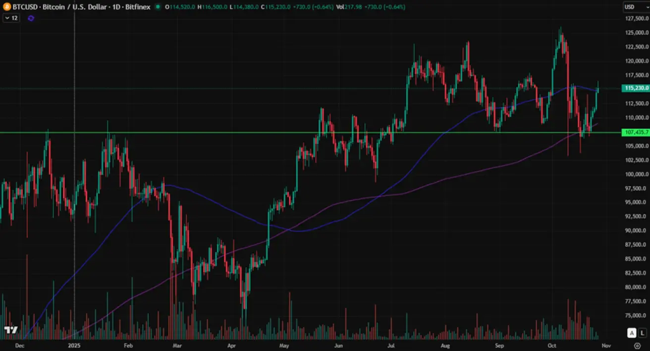 Weekly performance: +5.20% (week closed at $114,500). Year-to-date return: +22.12%.