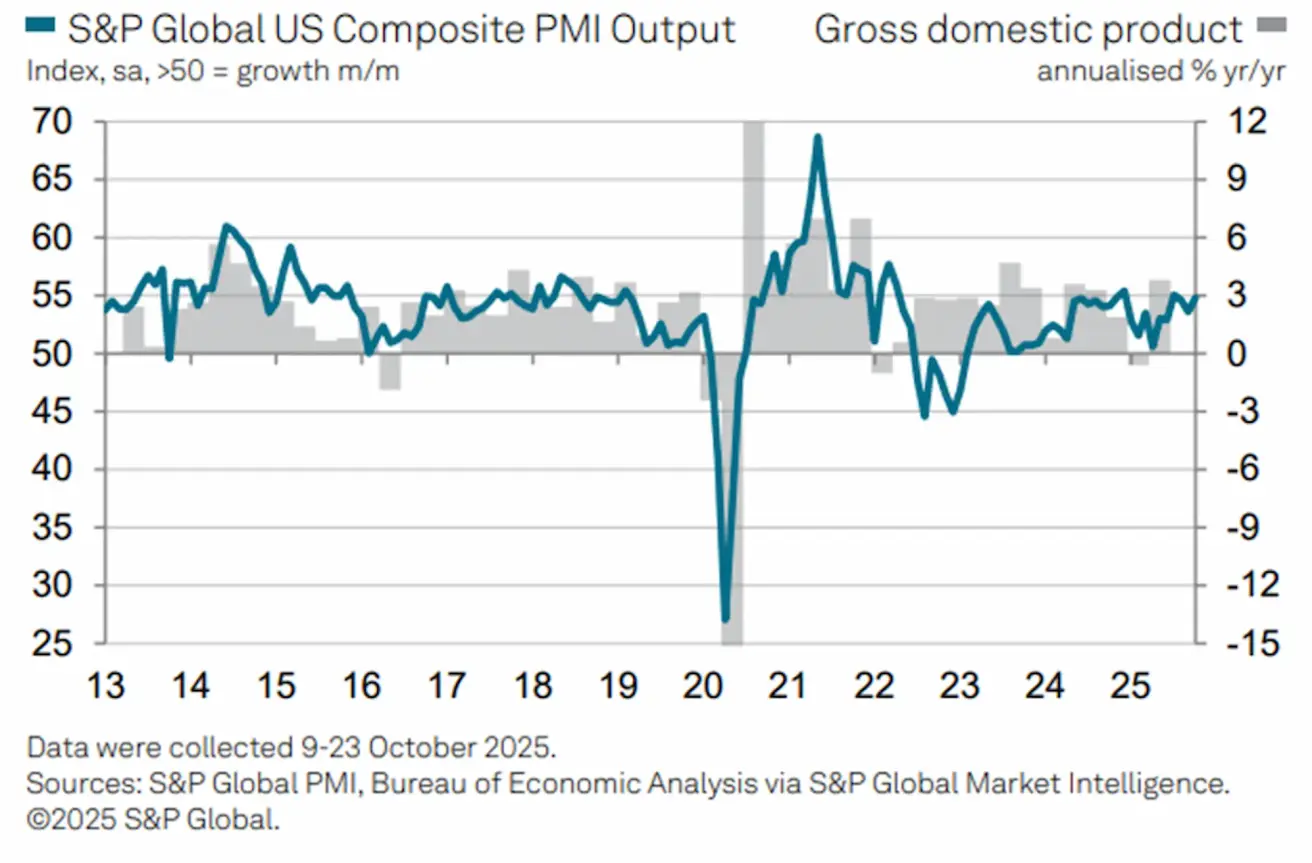 Preliminary PMI data for October point to solid and resilient economic growth at the start of the fourth quarter, with business activity gaining momentum in both manufacturing and services, despite some reports that firms were affected by the government shutdown.
