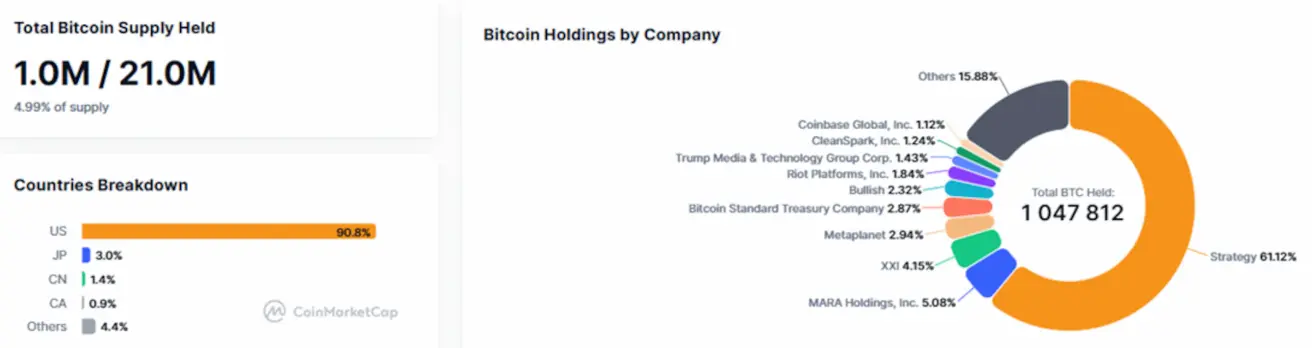 Public companies with Bitcoin Treasury strategies: the share of bitcoins held on corporate balance sheets remained unchanged from the previous week, standing at 4.99% (vs 4.92%) of the total bitcoin supply.