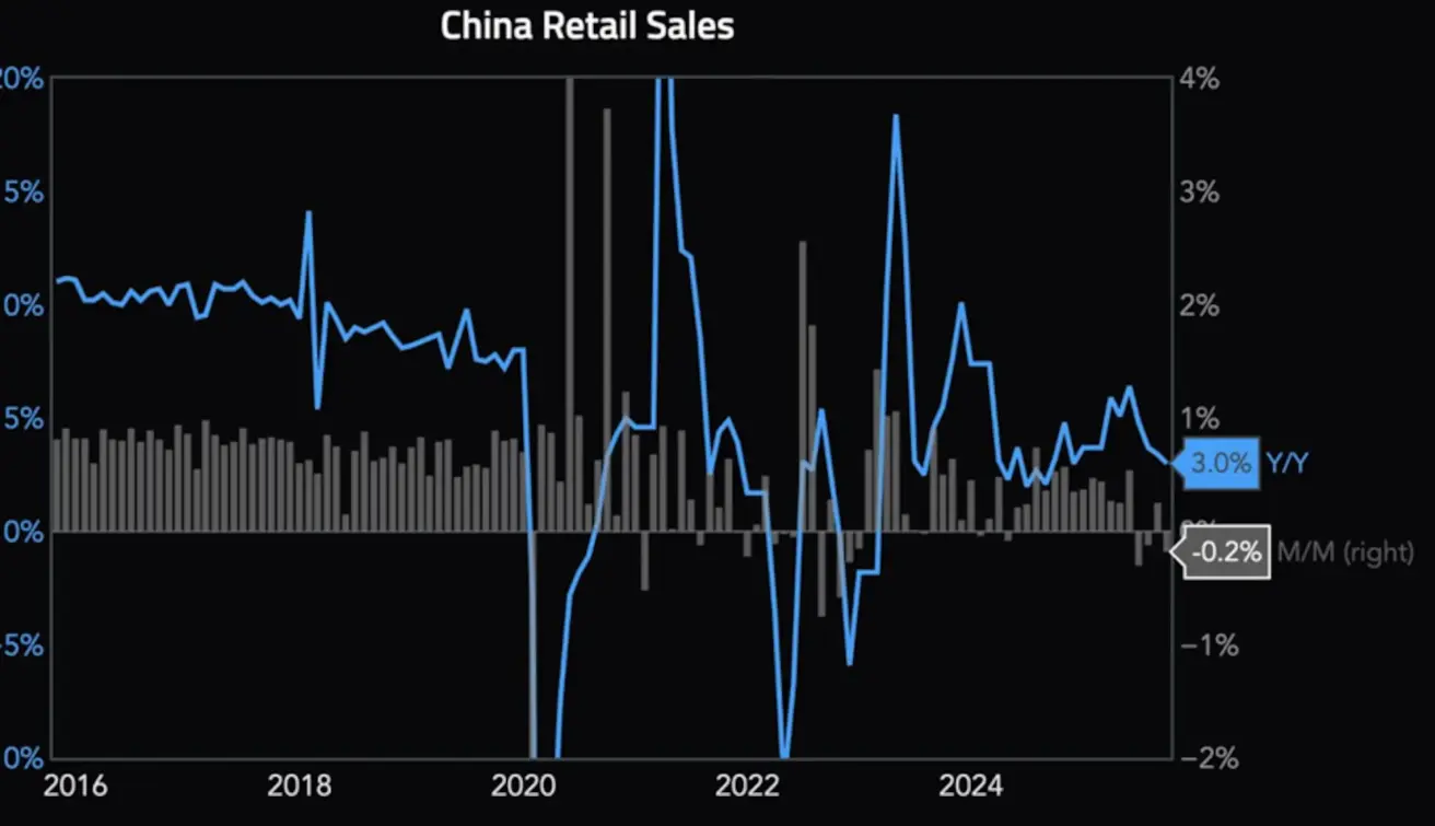 The People’s Bank of China (PBoC) left rates unchanged: the one-year loan prime rate remains at 3.0%, and the five-year benchmark rate stays at 3.50%. Fixed asset investment continues to decline for the fifth consecutive month, with the latest reading at -0.5%.