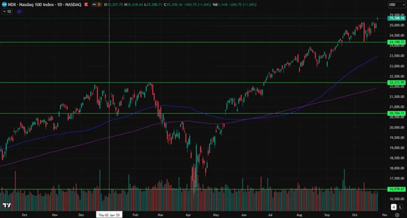Weekly performance: +2.18% (week closed at 25,358.16). Year-to-date performance: +20.07%.
