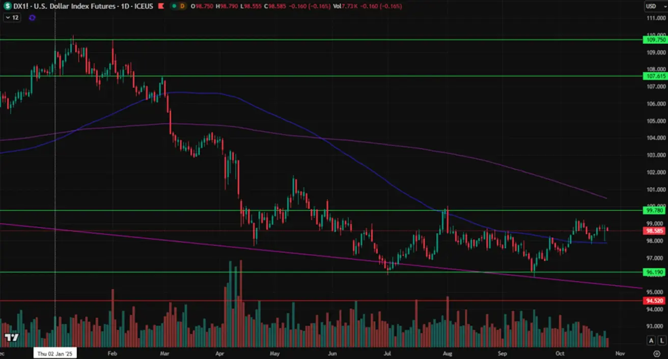 Weekly performance: +0.44% (week closed at 98.745).Year-to-date performance: –8.85%. Political uncertainty risks remain elevated.