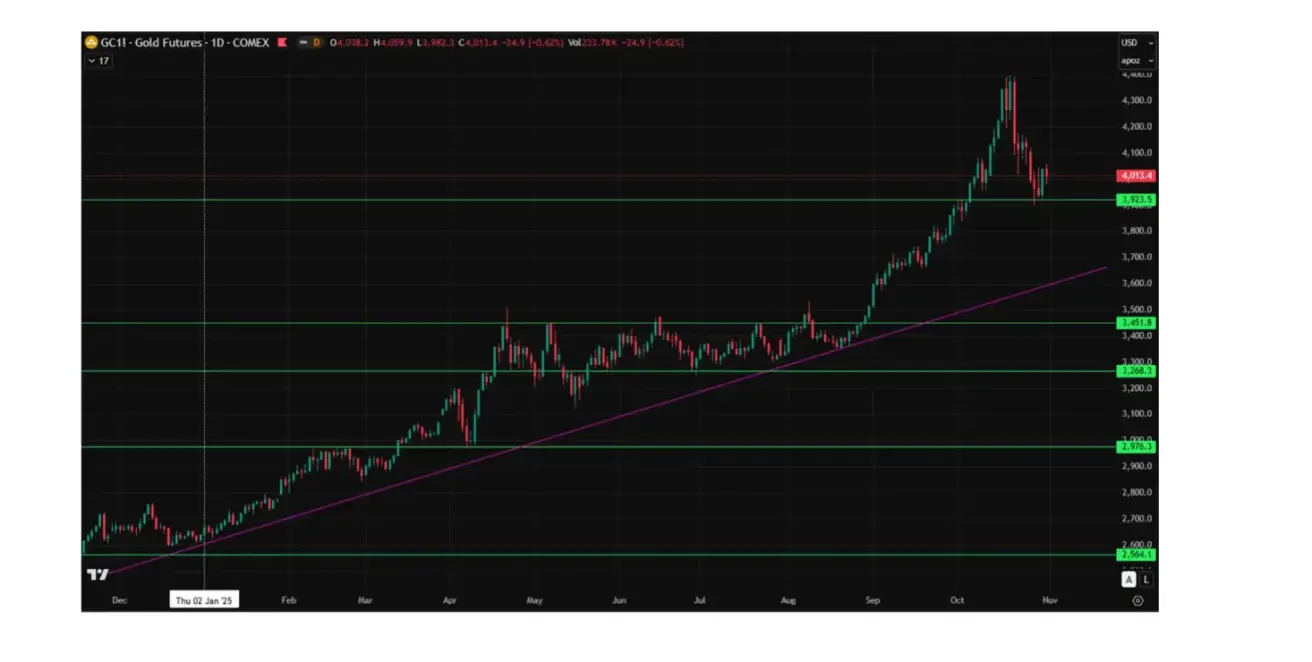 Gold futures (GC) ended the week down -2.75%, closing at $4,013.4 per troy ounce. Year-to-date performance remains strong at +51.97%.