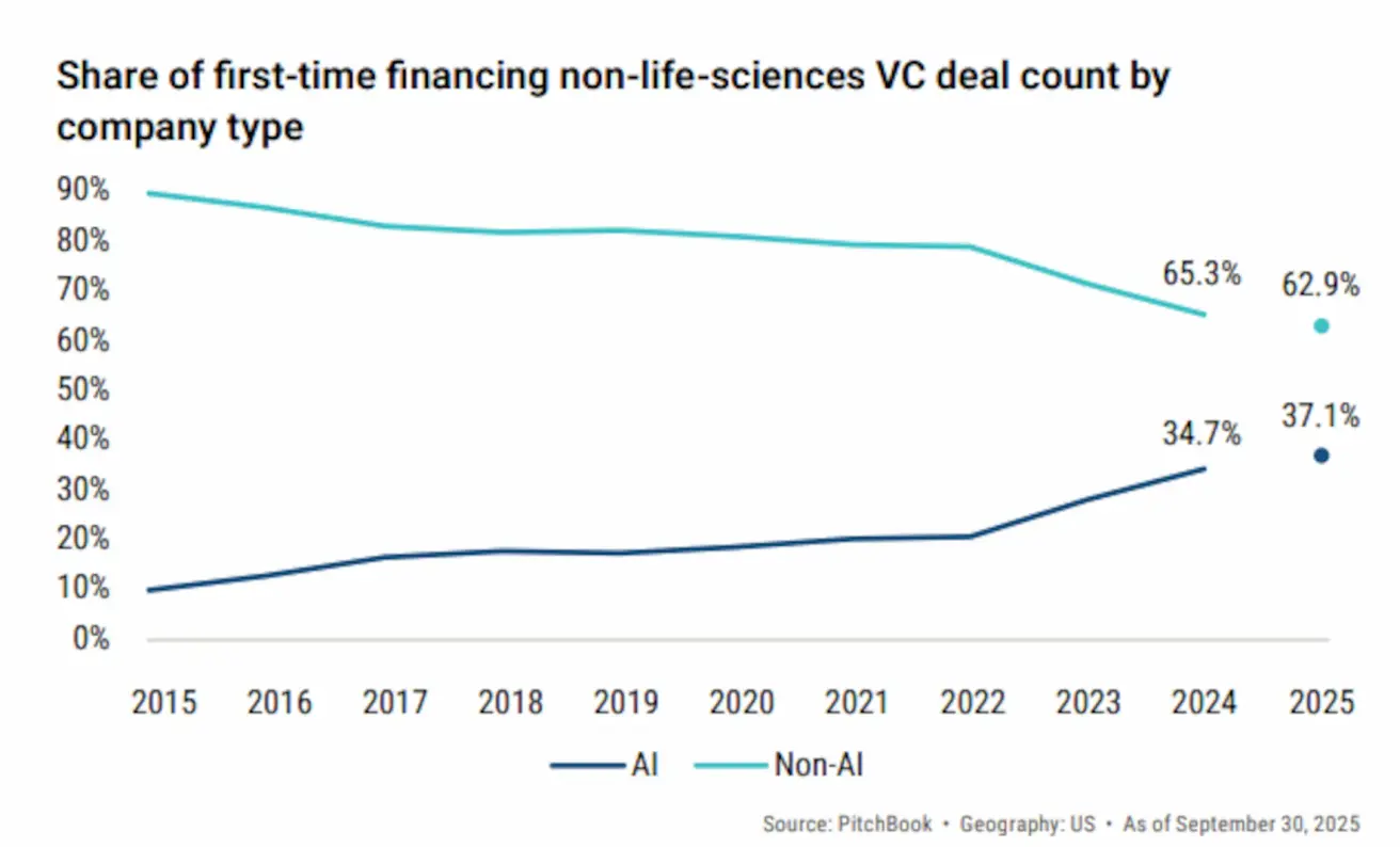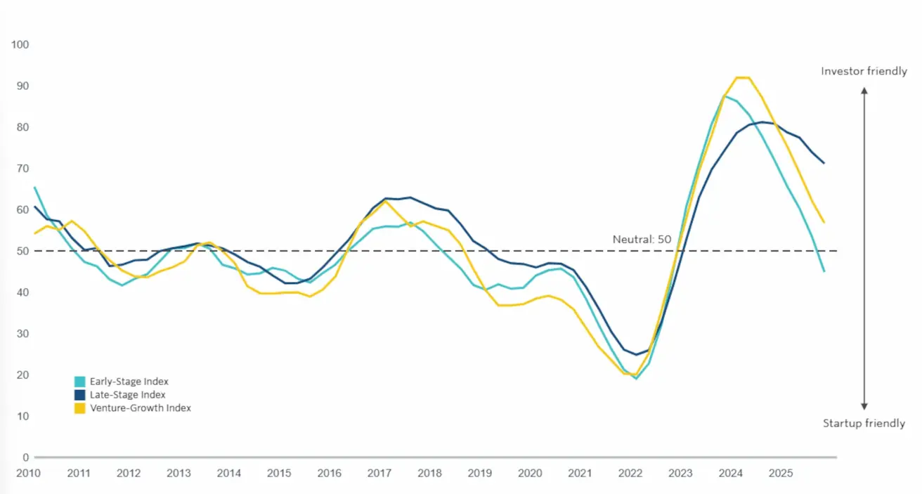 The PitchBook Dealmaking Index shows a shift toward a neutral zone after the “liquidity drought” of 2023–2024, when most investors had limited capital and large funds held stronger negotiating power. This movement reflects two parallel developments: an increase in available capital and a decline in the number of untapped startups in high-demand areas such as AI and defense technology. As a result, the balance between investors and companies is stabilizing, and fundraising conditions are becoming more predictable.