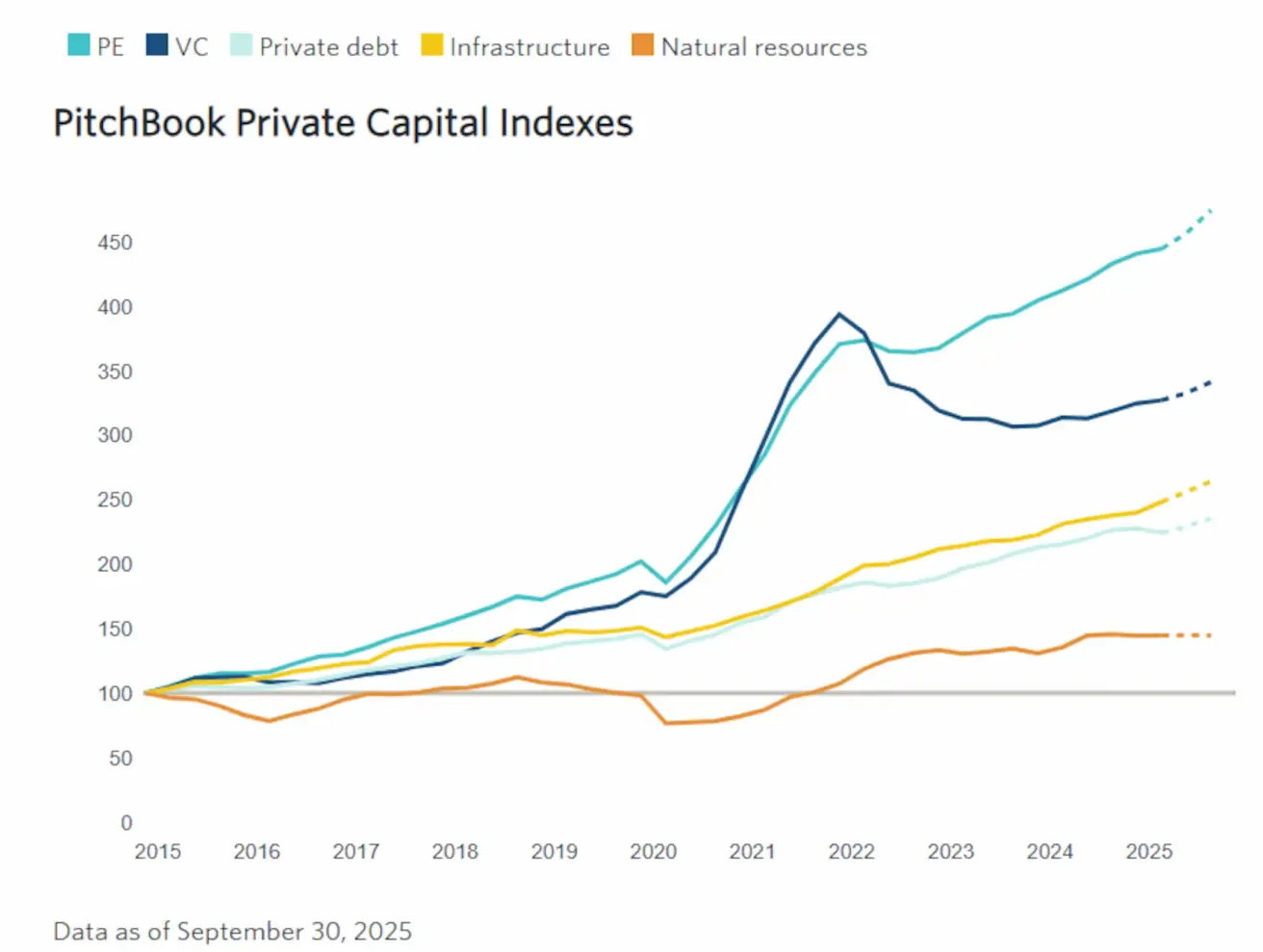 A similar pattern is visible in the broader PitchBook Private Capital Indexes: investment levels are rising across nearly all major private-market segments — from Private Equity and Venture Capital to infrastructure and natural resources. This long-term upward trend suggests expanding capital availability and strengthening investor interest in alternative assets.