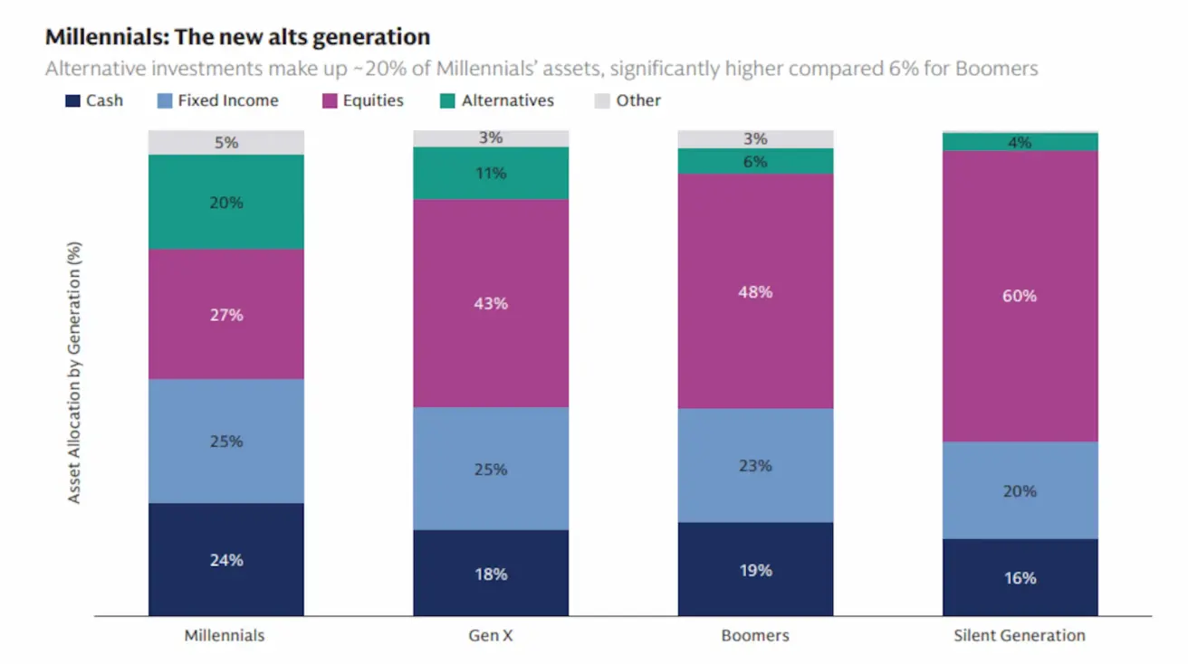 Interest in alternative assets is rising across all generations, but millennials stand out as the most active participants. Millennials, born between 1981 and 1996, are now the most economically active generation. With rising incomes and growing investment capacity, they play a key role in shaping demand for alternative assets, investing in private markets more actively than other age groups.