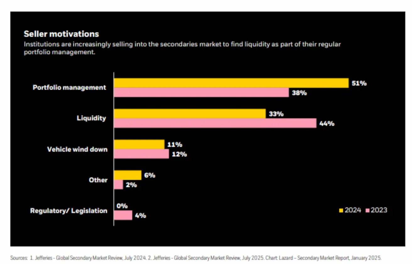 Survey data shows that in 2024, the secondary market was increasingly used as a planned portfolio management tool: 51% of sellers cited portfolio adjustments as their primary motivation (up from 38% a year earlier). The share of respondents selling assets to free up liquidity also increased to 44%. Together, these trends indicate that secondaries are becoming a regular mechanism for portfolio rebalancing and capital redistribution rather than a response to stress or regulatory pressure.