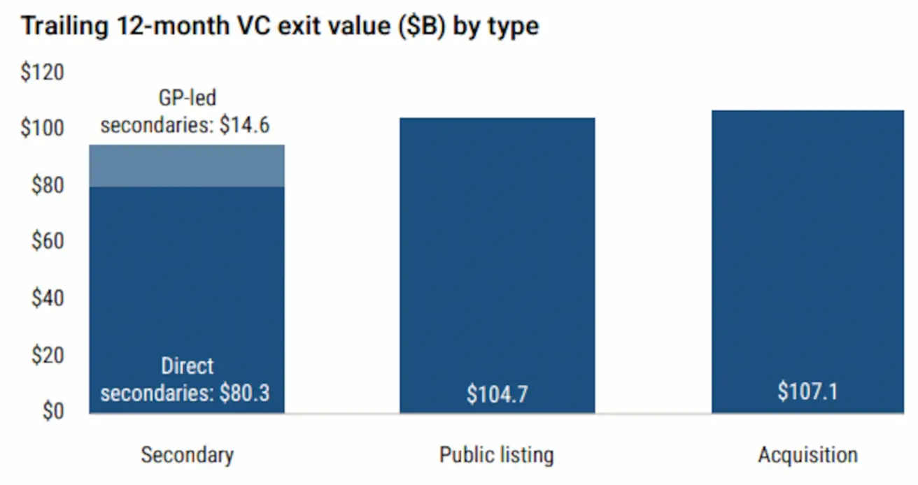 The chart below illustrates how secondary transactions have effectively become a full-fledged exit channel. Their combined value over the past 12 months ($94.9 billion) is now comparable to IPOs ($104.7 billion) and M&A exits ($107.1 billion). This demonstrates that secondaries are evolving into a stable, scalable liquidity mechanism for investors.
