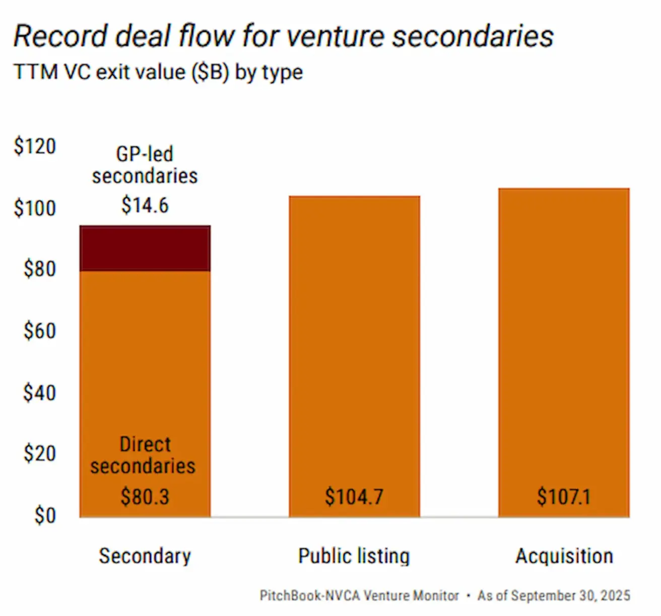 In effect, the secondary market has approached the scale of IPOs and has become a critical liquidity mechanism for venture funds, institutional investors, and private wealth clients.