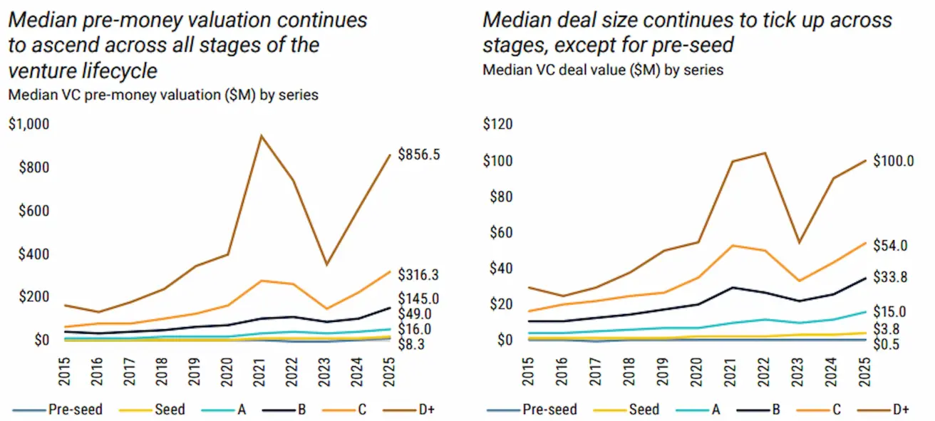 Despite the increase in total investment volumes, the number of venture deals remains below the 2021 peak. In 2025, 29,501 deals were recorded, down from 35,441 in 2021, a decline of 16.7%.