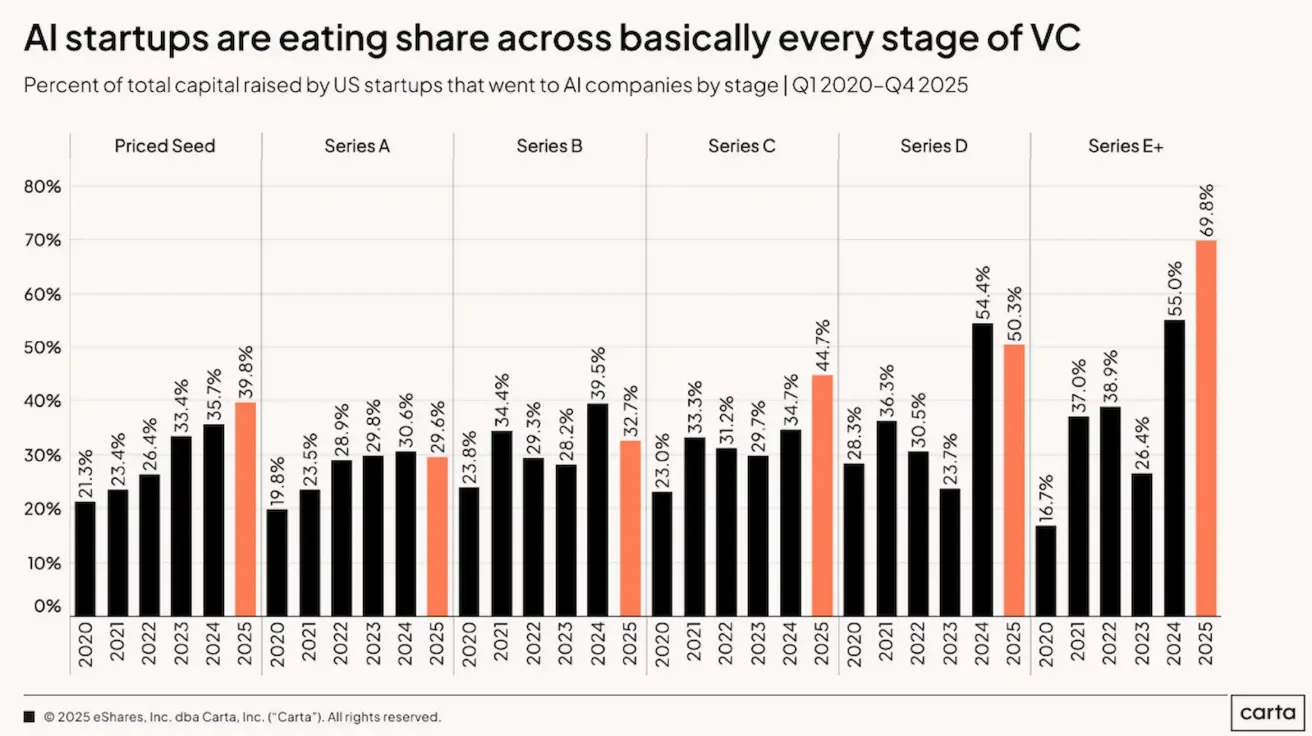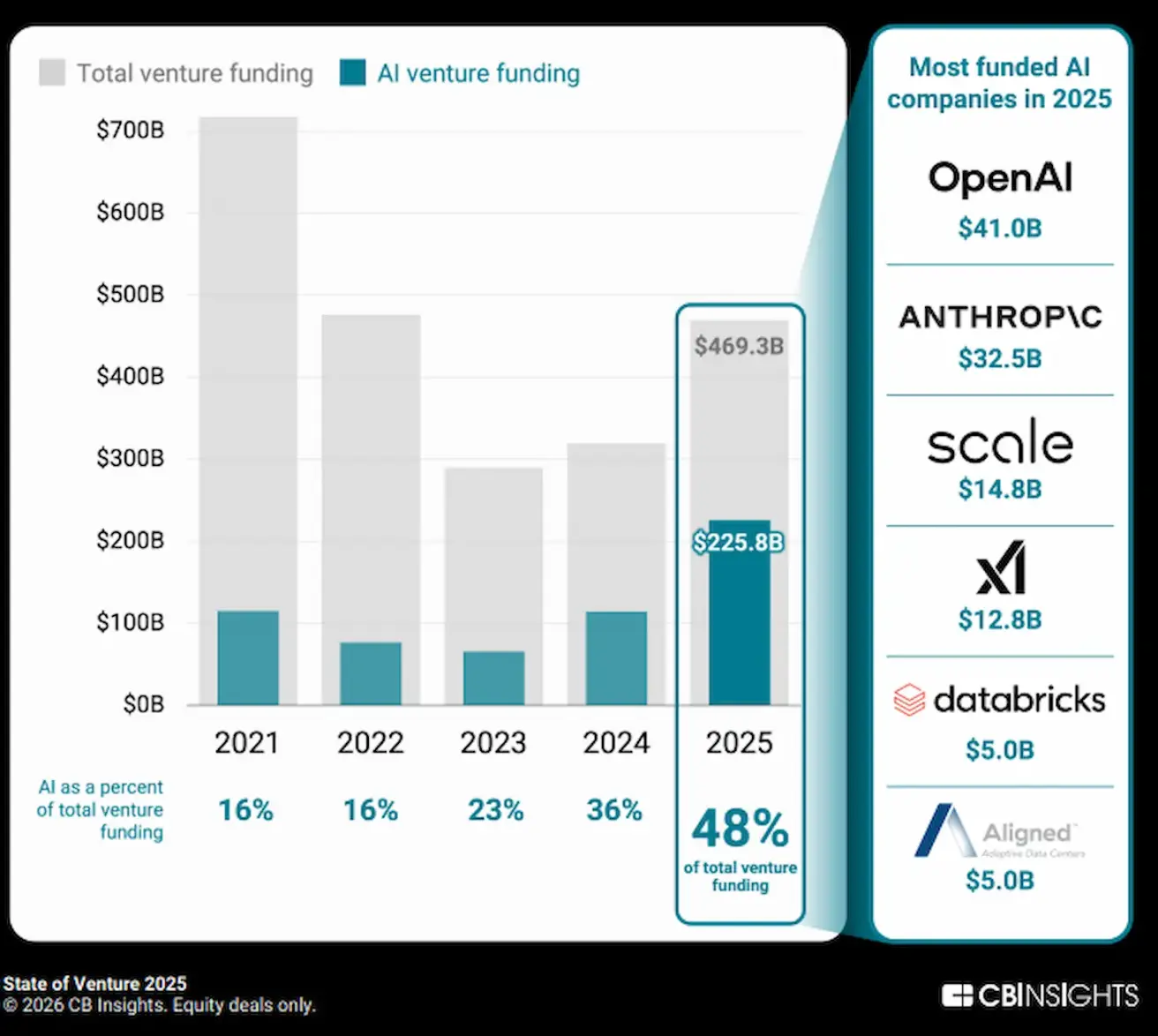 In 2025, AI accounted for 48% of all venture investment, equivalent to $225.8 billion. This is the highest share ever recorded for a single vertical over the entire observation period.