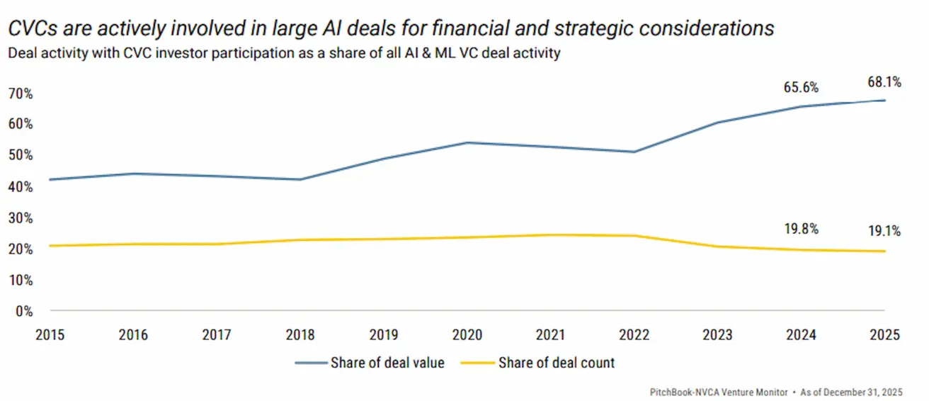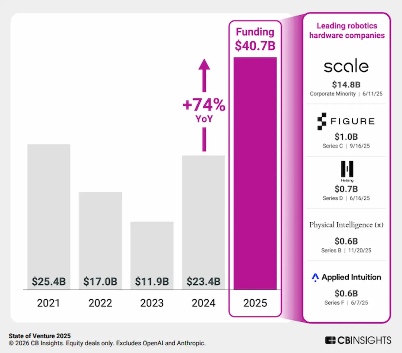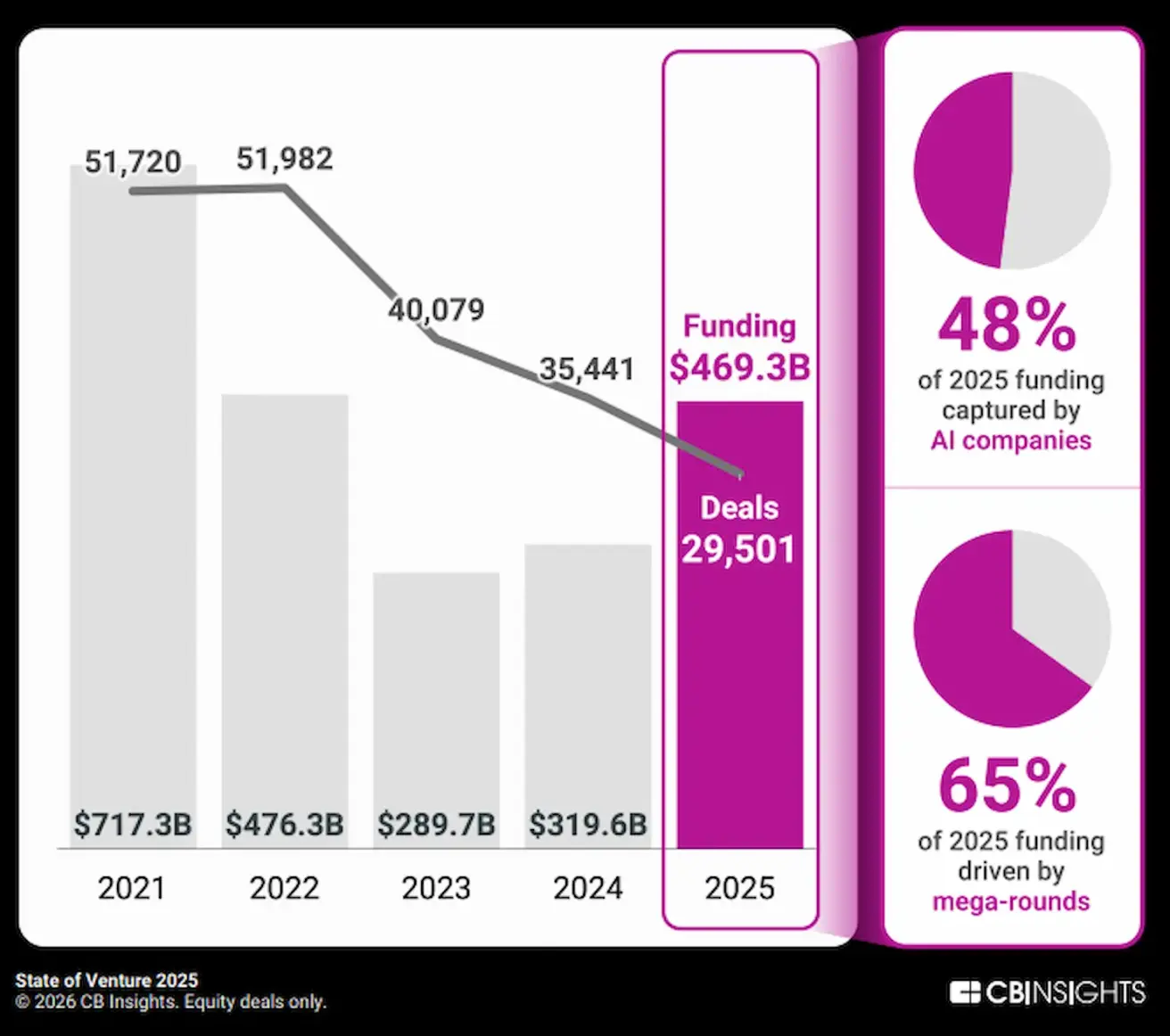 According to CBI, total global venture investment in 2025 increased by 46% year over year. In absolute terms, the market nearly returned to its 2022 level, with a gap of approximately 1.5%. This indicates a recovery in the scale of venture financing without a return to the extreme levels observed in 2021.