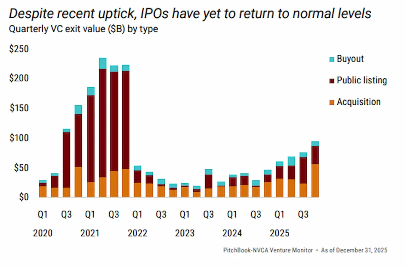 Although aggregate exit volumes have not yet reached 2020 levels, the number of exits in 2025 exceeded that of 2020.