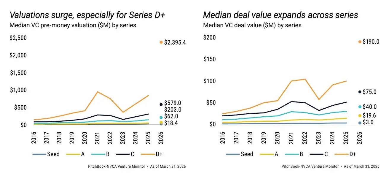 Broader market interest is further confirmed by valuation data. Median pre-money valuations are rising at every stage — from Seed to Series D+, where the median has reached $2.395 billion. Median deal size is also expanding across all stages.