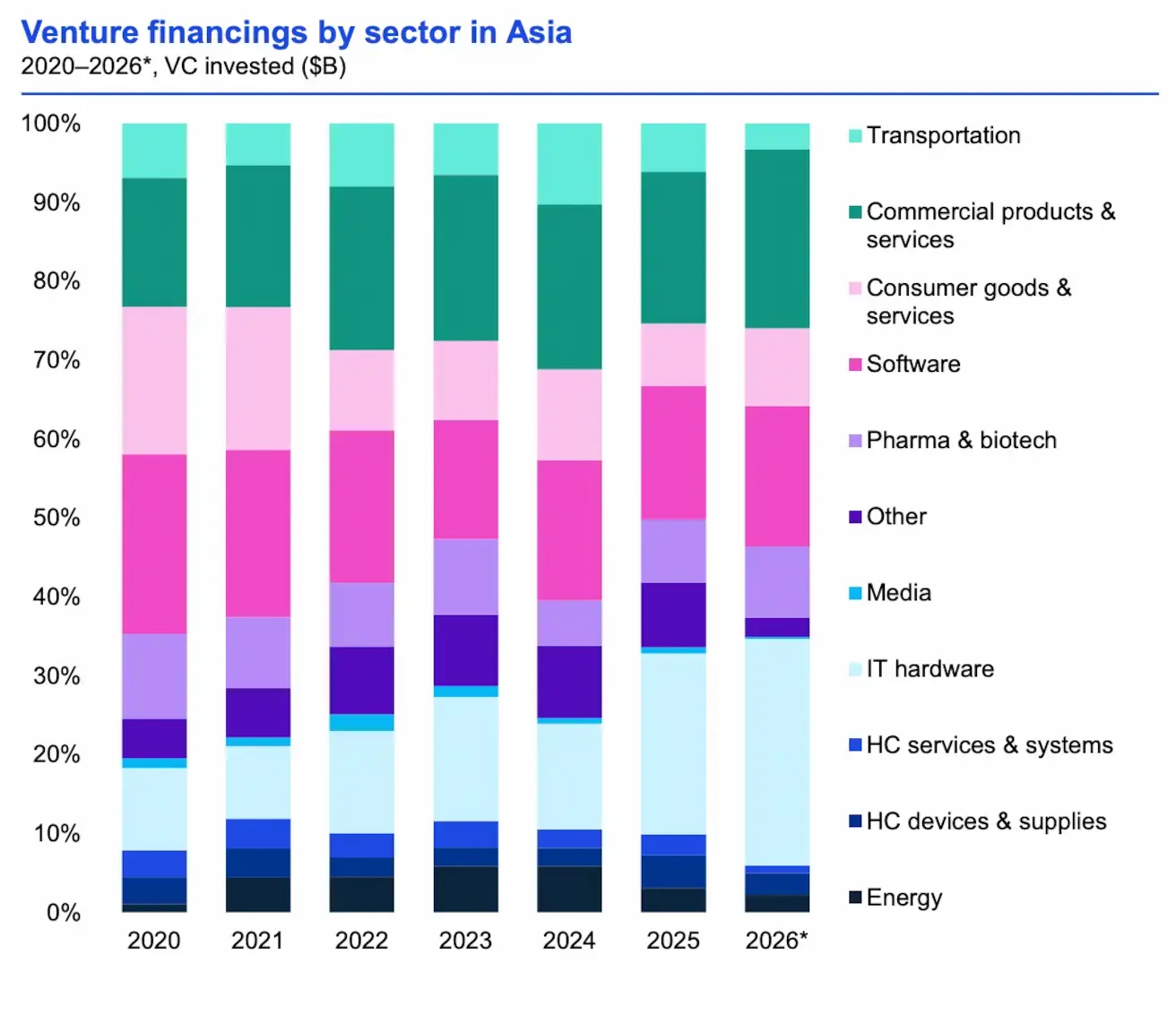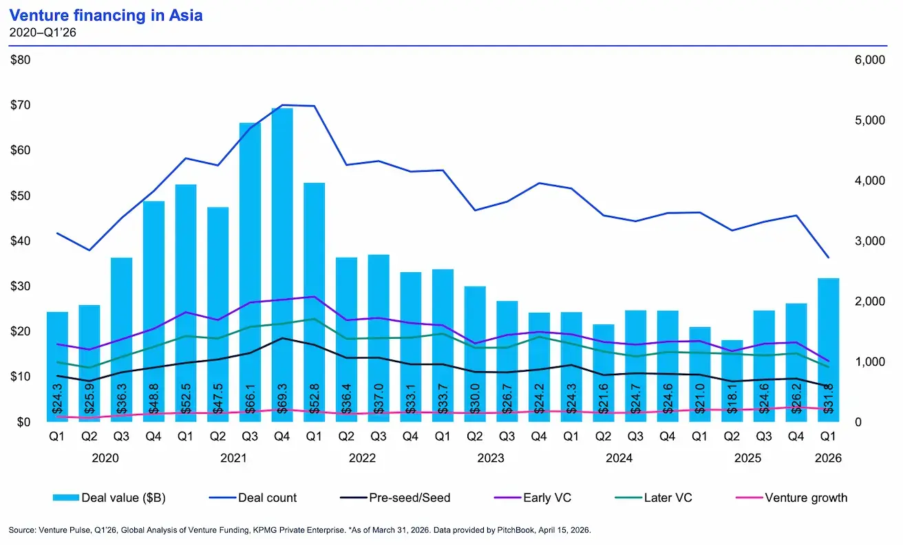 Chart: Investment volume and deal count by stage in Asian venture, 2020–2026.