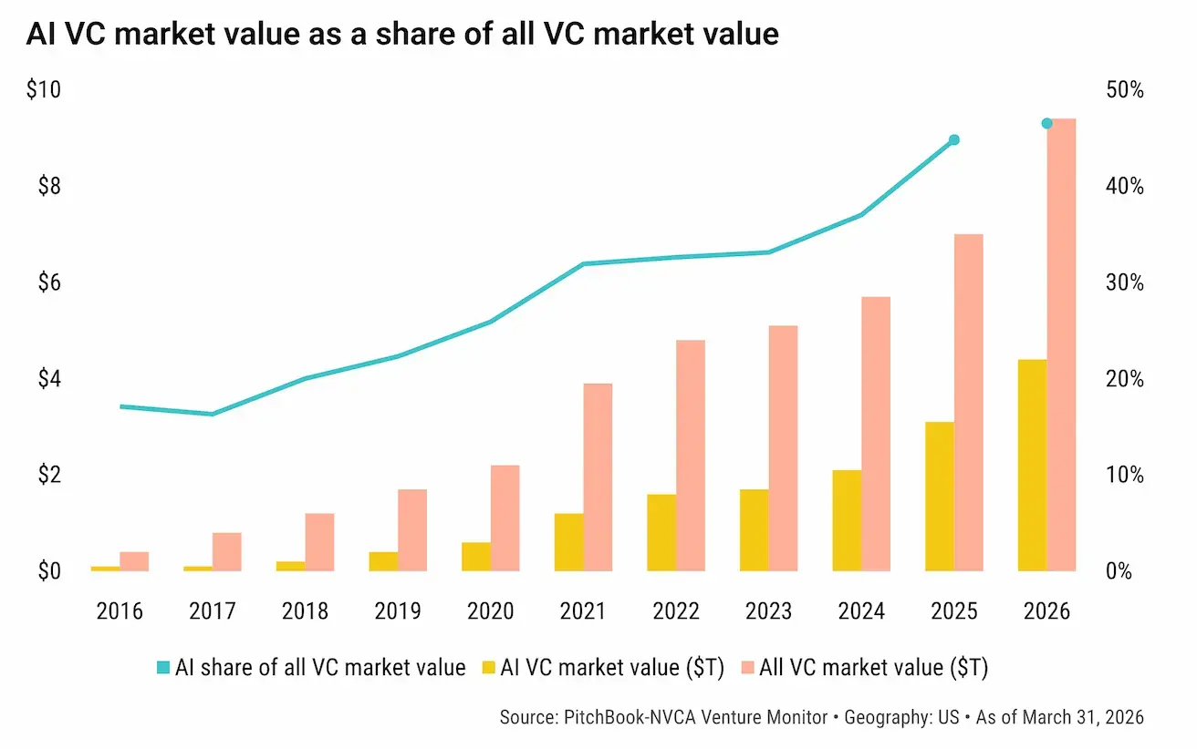 Q1 2026 became the most active investment quarter on record. The total venture market value reached $9.4 trillion — nearly half of which belongs to AI companies: $4.41 trillion, or 46.5% of the total. Just a few years ago, such a concentration of value in a single sector would have seemed like an exaggeration. Today, it is simply a market fact.