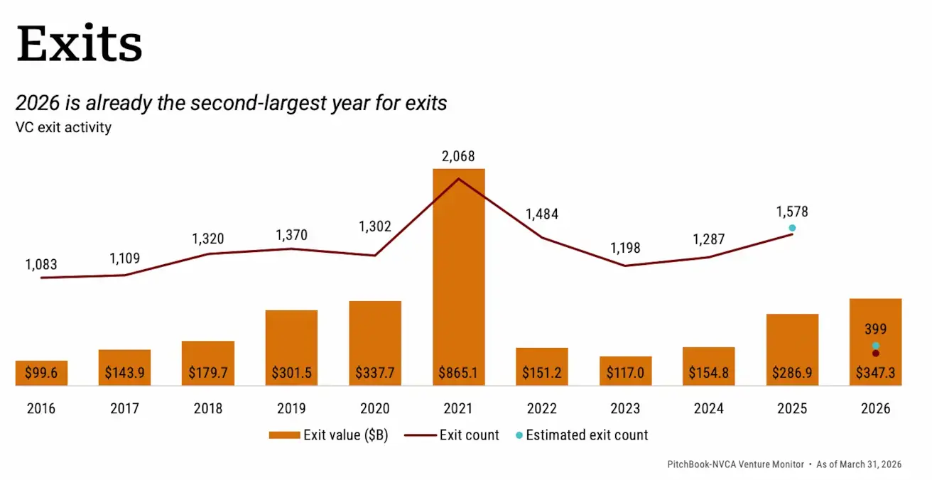 Q1 set a record not only in investments but also in exit volume — $347.3 billion. On this measure, 2026 has already secured second place in venture exit history, trailing only 2021.