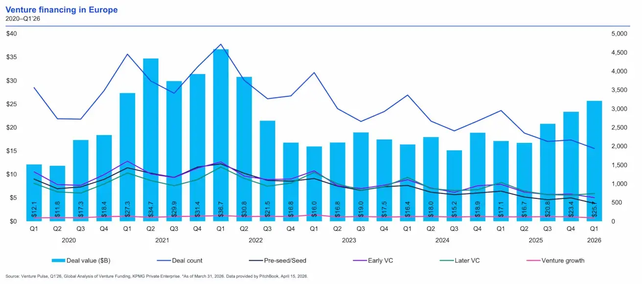 Chart: Investment volume and deal count by stage in European venture, 2020–2026.