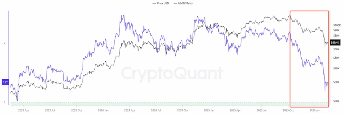 Ончейн-метрика MVRV сравнивает текущую рыночную стоимость биткоина с так называемой «реализованной стоимостью» — ценой, по которой монеты последний раз перемещались в блокчейне. Это позволяет оценить, находятся ли держатели в прибыли или в убытке.