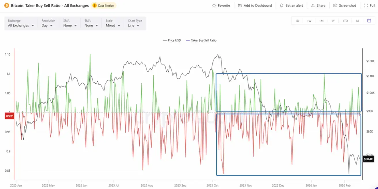 Показатель Taker Buy/Sell Ratio в период после 10 октября преимущественно находился ниже 1, что указывает на доминирование агрессивных рыночных продаж.