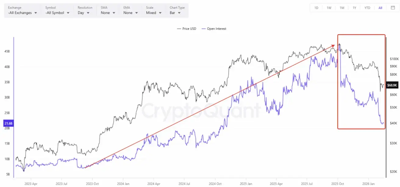 После 10 октября 2025 года произошло резкое сокращение OI — примерно с $45 млрд до ~$22 млрд. По сути, рынок вернулся к уровням ноября 2024 года, что означает масштабное сокращение позиций.