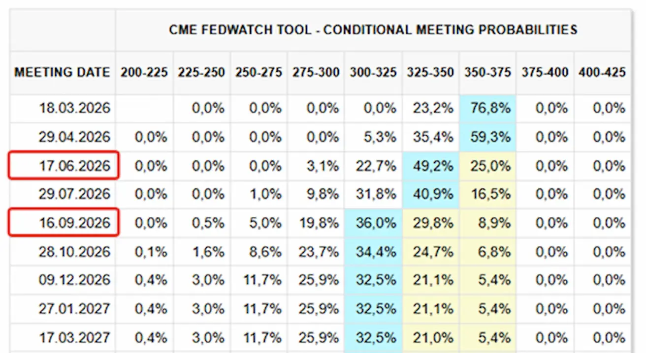 В течение следующих 12 месяцев рынки закладывают два снижения ставки по 25 базисных пунктов, что приведет целевой диапазон к 3,00%–3,25%. Первый шаг в настоящий момент ожидается в июне, примерно через три заседания.