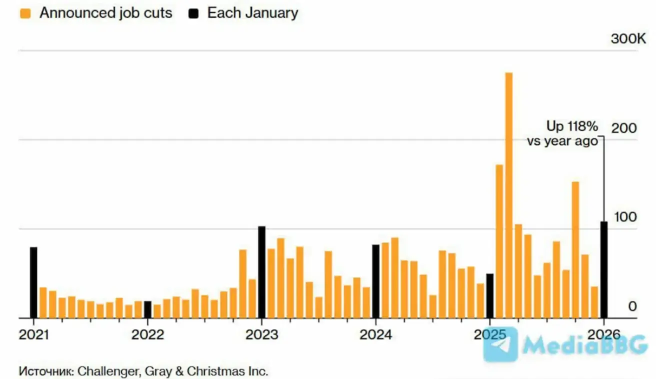 В то же время компании США объявили о самом крупном количестве сокращений рабочих мест за январь с 2009 года в рамках текущего отчетного сезона.