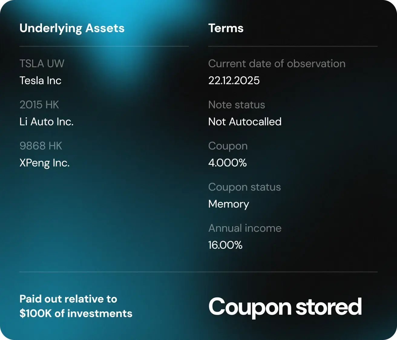 Даже при временной коррекции отдельных бумаг, эффект памяти защищает доходность инвестора, сохраняя купоны до восстановления рынка. Мы продолжаем структурировать продукты на базе актуальных макротрендов, соблюдая баланс между высокой доходностью и качеством защиты.